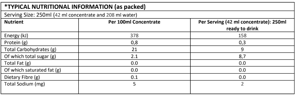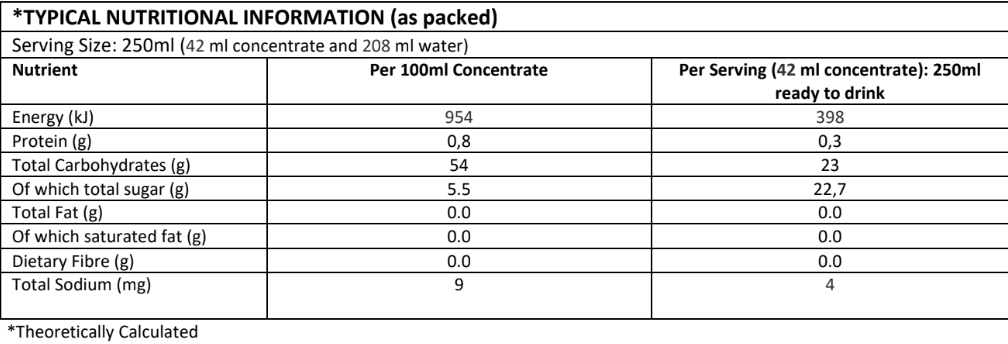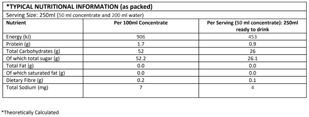 Water, Reconstituted Orange juice (20%), Reconstituted Mango juice (20%), Sugar, Stabilizers (E466, E405, E412), Flavoring, Citric acid (E330), Tri sodium citrate (E331), Preservatives: Sodium Benzoate (E211) Potassium Sorbate (E202) & Sodium Metabisulphite (E223), Non-nutritive sweeteners: Acesulfame K (E950), Sodium Cyclamate (E952), Stevia (E960), Colorant: Beta Carotene (E160a) and Anti-foaming agent.
